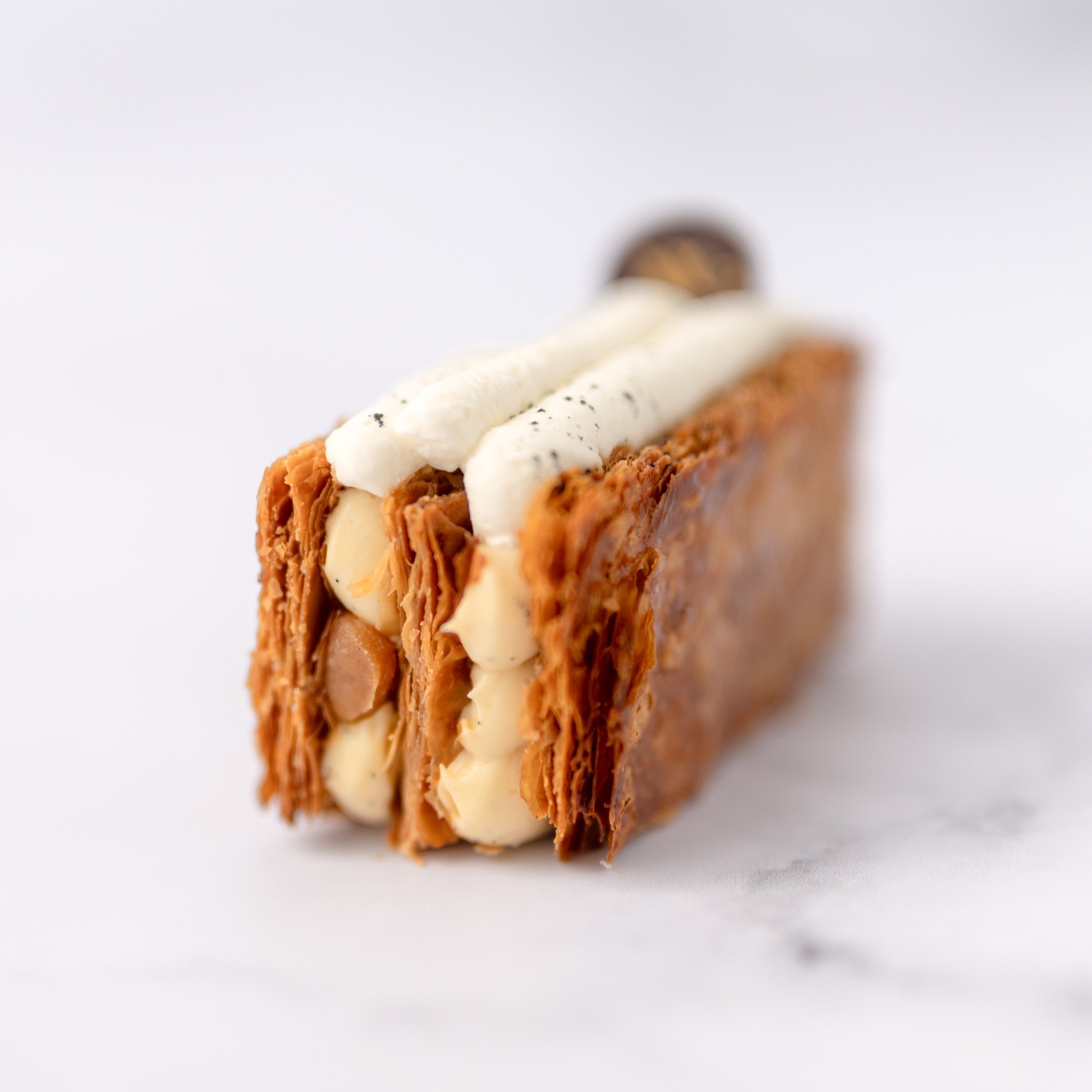 Le millefeuille est composé de pâte feuilletée pur beurre légèrement caramélisée, d’une crème diplomate à la vanille de Tahiti et de caramel au beurre salé.