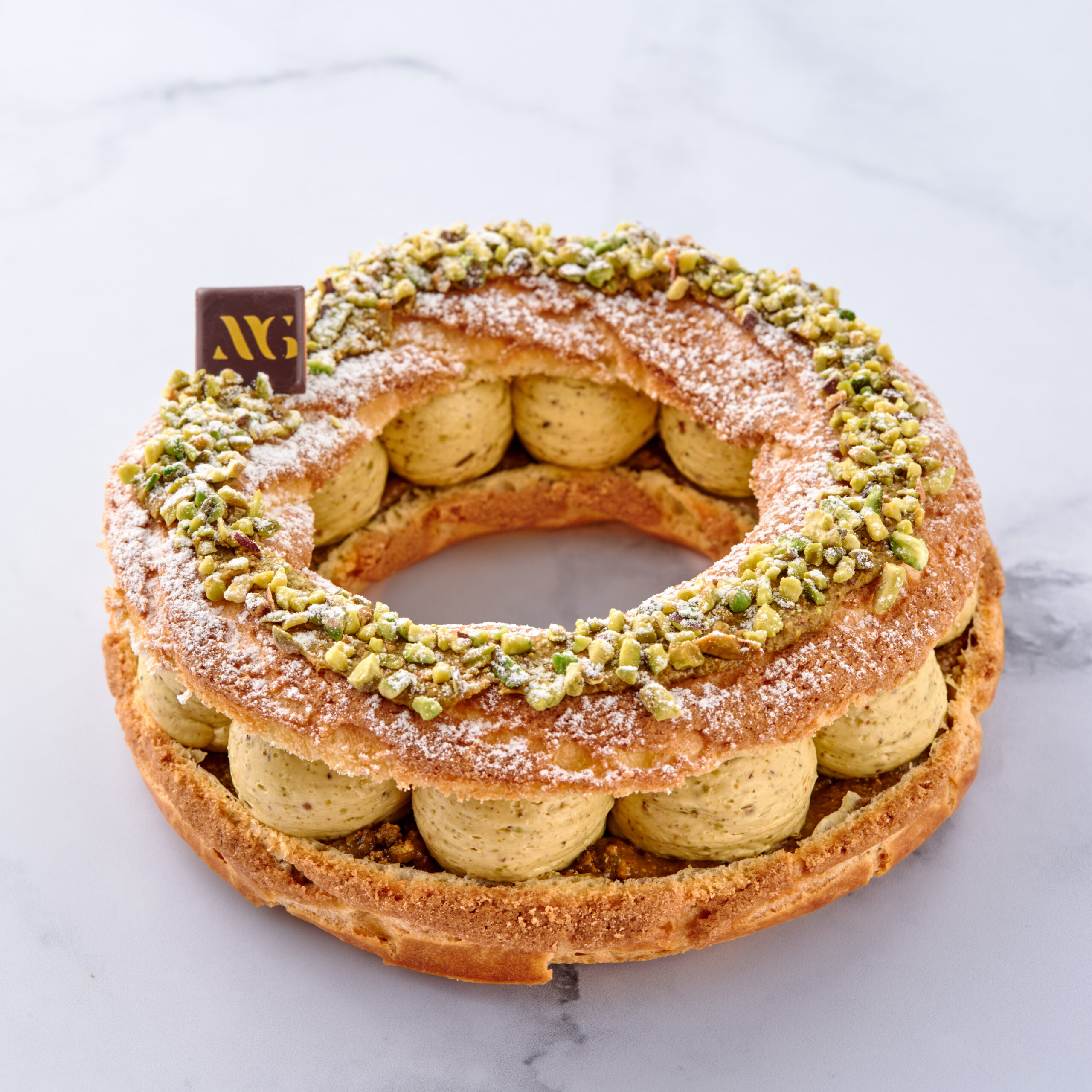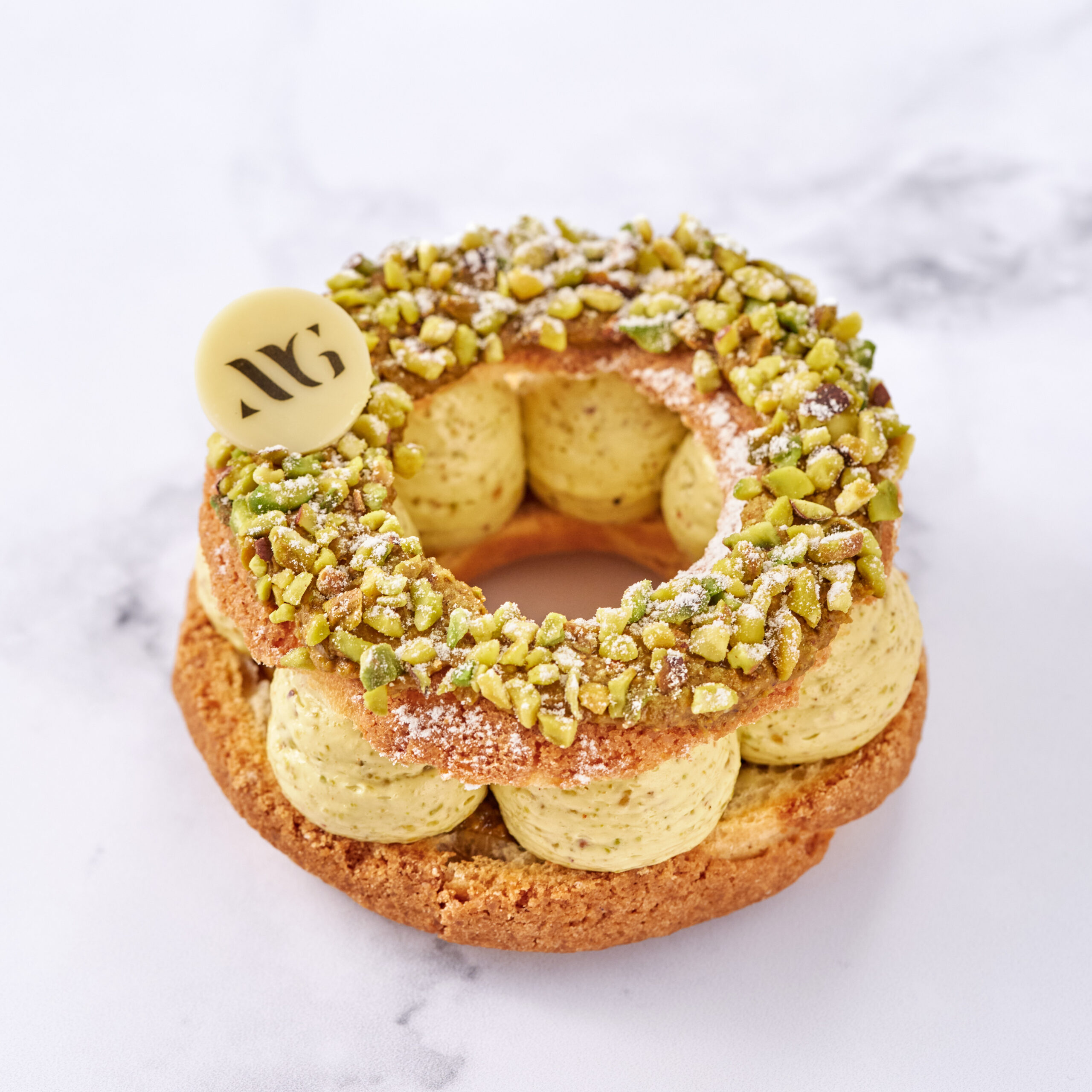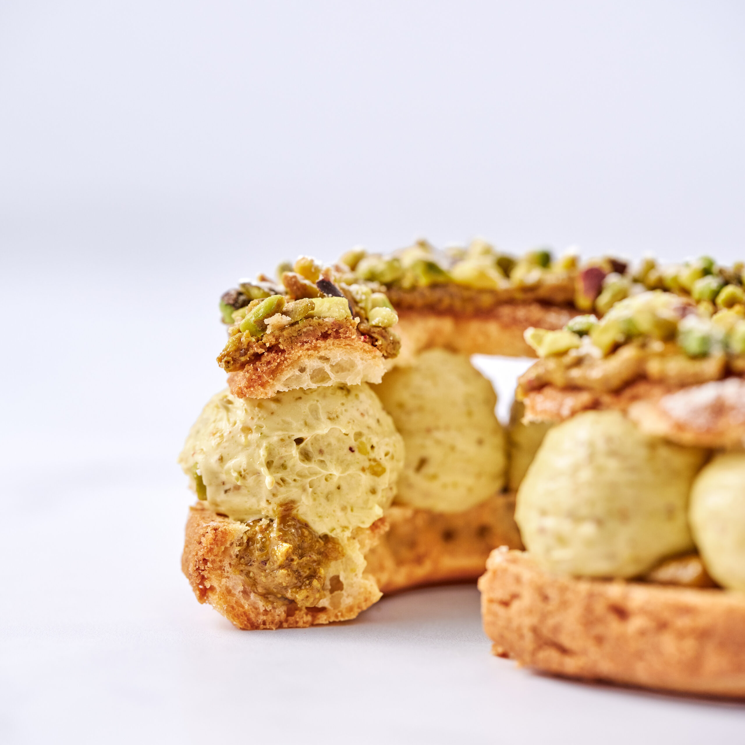 Le paris-brest à la pistache est composé d’une pâte à chou au craquelin, d’une crème mousseline à la pistache de Bronte et d’un cœur de praliné pur à la pistache verte d’Iran.