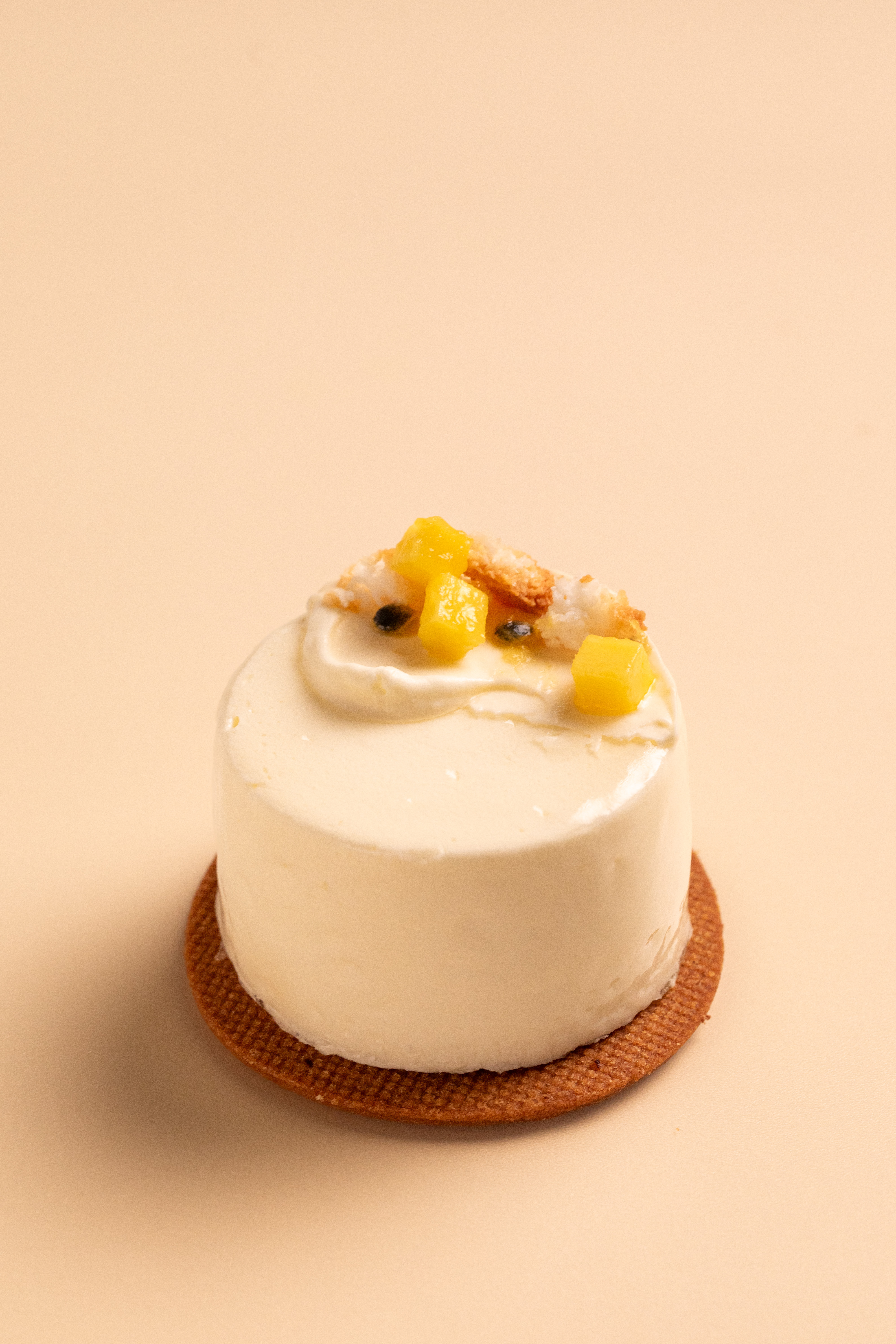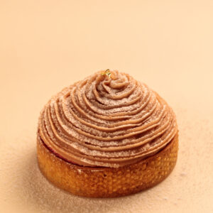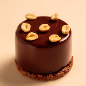 L’entremet Pumpkin & Caramel est composé d’une mousse au chocolat dulcey, d’un crémeux à la noix de pécan, d’un biscuit pumpkin aux épices, d’un croustillant au riz soufflé et noix de pécan, d’un glaçage dulcey.